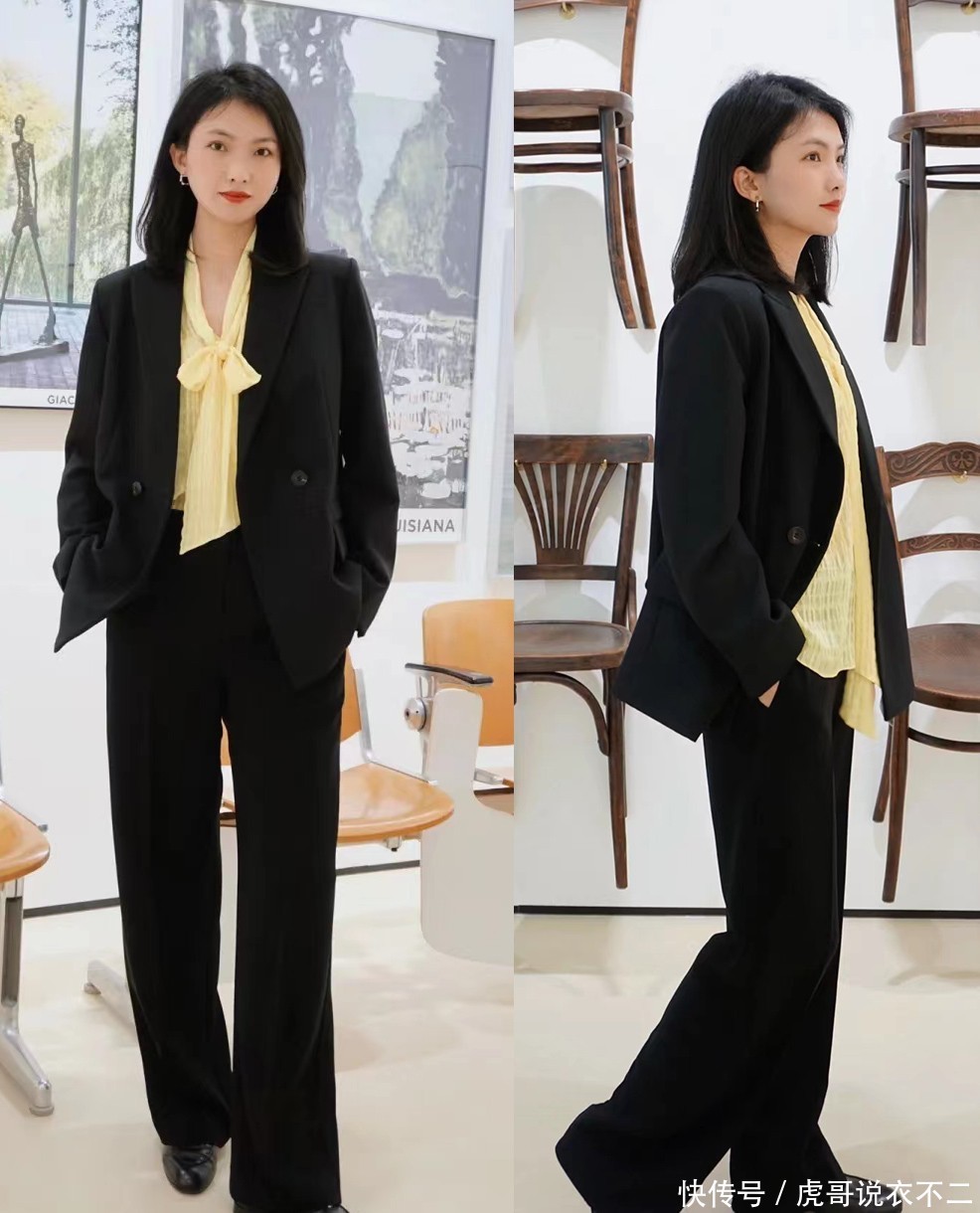 穿衣作风比拟保守的女性,在西装色彩的挑选上,也一直接续着基础又百搭的不雅念,就像这身玄色套装,它的色彩组成要更深千里,不错使女性看起来愈加隆重熟悉,但若是不配一件不错对造型有提亮后果的黄色衬衣,就容易使形象看起来太过千里闷没趣。