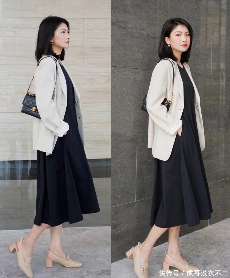 这件玄色连衣裙是从简又不挑东说念主的形式,宽松的裙身+过膝的裙摆长度,不错带给身材比拟好的包容性,用白色小西装搭配的话,不错不劳苦的收成高档优雅的一面。