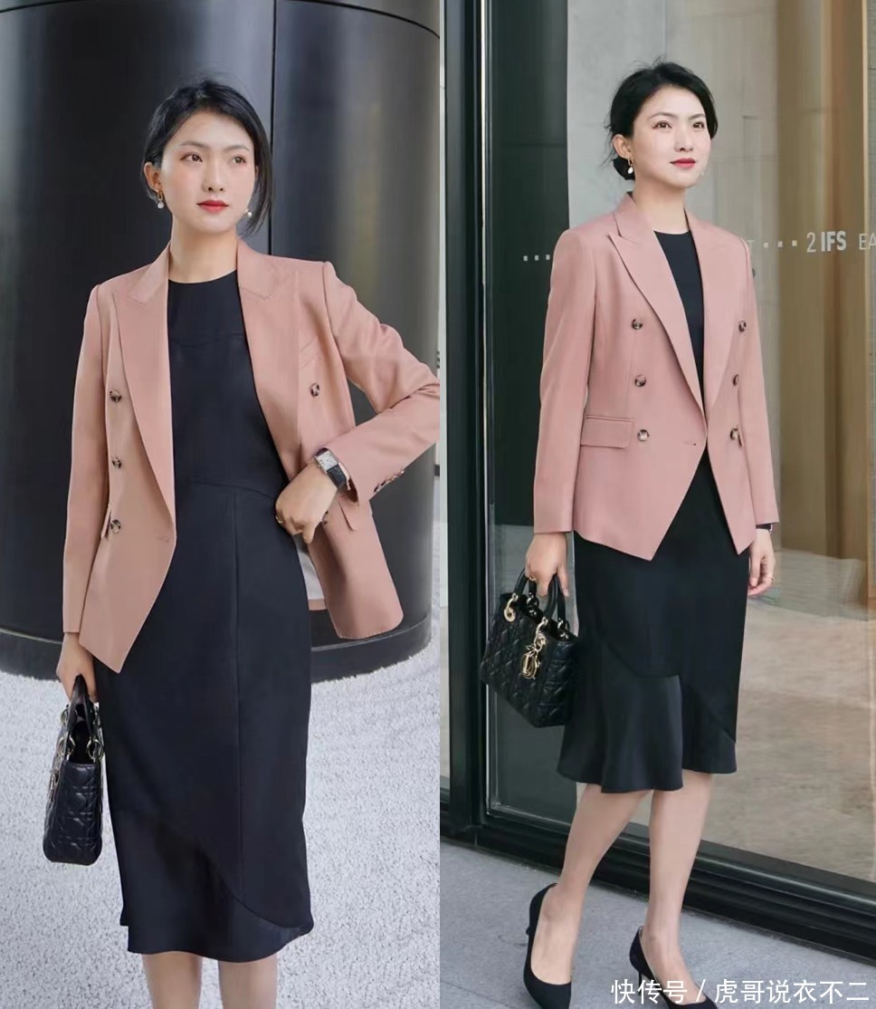 在夏天神用玄色服装时,一般齐需顺序受其他类型的色彩均衡举座作风,像上图这件连衣裙相同亦然玄色筹画,而使用浅粉色小西装匹配,就不错通过深与浅的对比,中庸造型后果,但粉色带来的甜好意思,又与裙子的作风相呼应,一同呈现出知性又隆重的嗅觉。