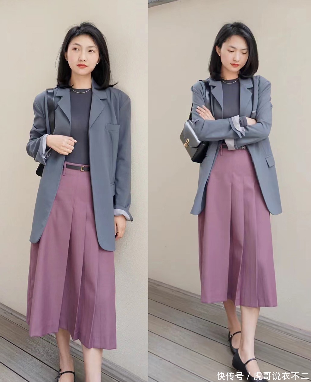 半身裙的搭配更天真一些,但为了保持更优好意思的身姿,不妨也禁受扎衣角的穿法,加入玄色腰带,还能将腰线位置再次加以强调,这么即使搭配的是比拟宽大的小西装,也依旧不错穿出修长优厚的身材比例。