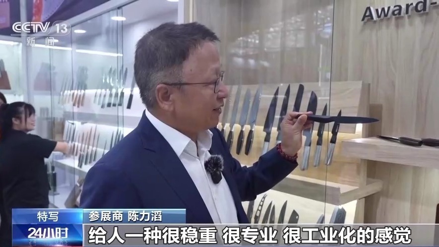 参展商 陈力滔:从蓄意的角度来讲,它是纯黑的刀具,给东说念主一种很介意、很专科、很工业化的嗅觉。它是不粘涂层的,咱们加入了抗菌的因素在这个刀具内部。