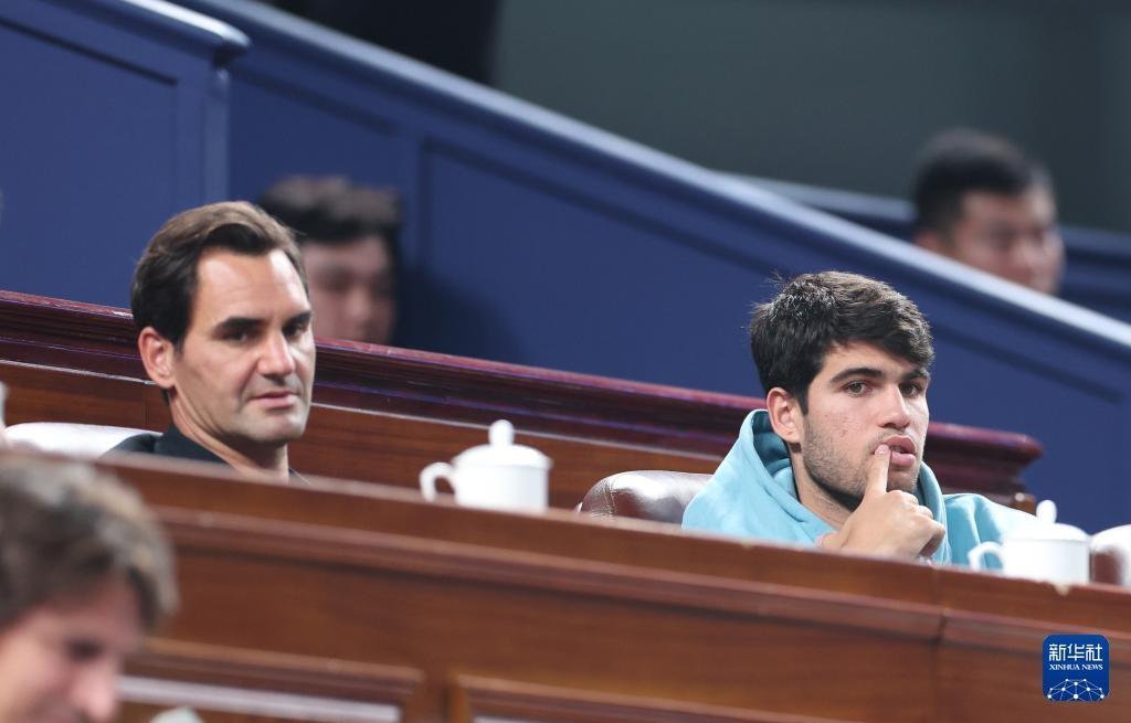 10月13日,阿尔卡拉斯和费德勒(左)在场边不雅看比赛。